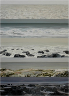 Bei einer Reihe von Arbeiten sind die Maße und die Proportionen der Leinwand der wichtigste Ausgangspunkt. Bei der Auswahl des Formats lässt sie sich von der Architektonik der Landschaft leiten. Indem sie etwa für eine Brandung ein längliches Bildformat verwendet, entsteht der Effekt eines Bandes, das der Länge nach meterweise abrollbar ist. Durch die ungewöhnliche Breite der Leinwand wird das Brandungsmotiv so isoliert, dass eine eigene visuelle Wirklichkeit entsteht, wobei der Horizont seinen ursprünglichen Ausdruckswert verliert und neue Erfahrungen und Bedeutungen evoziert werden. |
