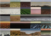 Bei anderen Bildern dienen ihr mehrere Landschaften als Ausgangspunkt. Indem sie diese in einem Raster auf einer einzigen großen Bildfläche anordnet, entsteht ein Gefüge aus geradlinig-rechtwinkligen Flächen. In der ersten Anlage sind die Landschaften naturgetreu wiedergegeben. Im folgenden Stadium löst ten Berge sich von der Realität und stimmt Farbe und Textur der Einzelbilder aufeinander ab, um zu einer ausgeglichenen Komposition zu finden. Im Bildganzen sorgt der Wechsel von statischen und dynamischen Landschaften für ein spannungsreiches Spiel mit Farbe, Kontrast und Rhythmus. |