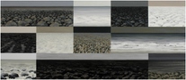 Die Idee zu den kombinierten Landschaftsbildern ist zufällig entstanden. In ihrem Atelier hingen mehrere kleine Bilder in einer Reihe nebeneinander. Die durchgehende Horizontlinie faszinierte sie derart, dass sie beschloss, diese „natürliche“ Linie für ein Raster aus Linien zu nutzen. |